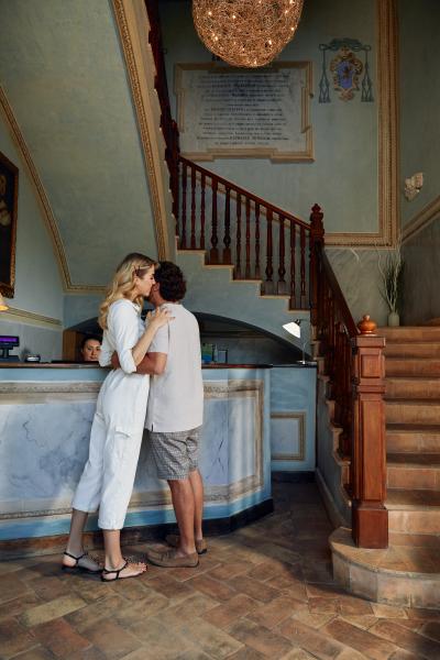 Ogni angolo della residenza è arricchito da camini monumentali, affreschi che raccontano storie di un tempo passato e affascinanti travi a vista.