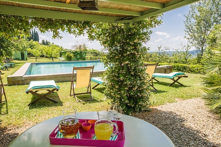 Al piano terra troviamo dei magnifici salotti, luminosi, eleganti e arredati con mobili di pregio, oltre che lo splendido Salone da Ballo caratterizzato dal soffitto a cassettone, un ampio camino rinascimentale e pavimento dipinto. Accanto, la biblioteca ottocentesca che si affaccia, con due grandi porte finestre, sul giardino. La villa presenta 9 camere da letto, tutte arredate in stile toscano con preziosi mobili d'epoca,pavimento piastrellato o parquet, e alcune sono dotate di area salotto e camino. Una bella scala decorata collega il piano terra al primo piano, che ospita tre eleganti camere denominate Contessa Mita, Conte Filippo e Cielo. Al secondo piano troviamo un salottino dotato di tapis roulant, che si affaccia su una terrazza con vista giardino; un salotto con decorazioni settecentesche e quattro camere, di cui due con bagno privato: Giulia e Liz Taylor (che prende il nome dall’attrice che vi fu ospite alla fine degli anni cinquanta) e due con bagno in comune: camera Verde e camera Rosa. Fiore all’ occhiello della villa sono la Suite, con raffinate decorazioni settecentesche e bagno di 30 mq, e la rustica stanza nella Torre dove si respira ancora oggi un’atmosfera fiabesca. L'esterno è caratterizzato da un ampio giardino all'italiana di un ettaro, ideale per cerimonia matrimonio e banchetto; dal giardino si accede a un seocnod giardino alla francese con piante aromatiche, frutteto e piscina di 9m x 11m a sfioro con una meravigliosa vista sulle colline del chianti e su Firenze.