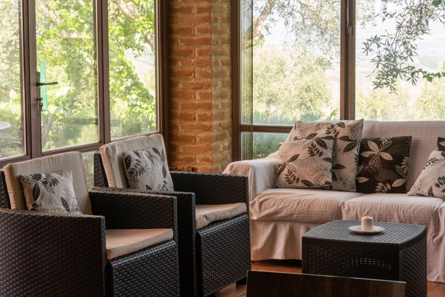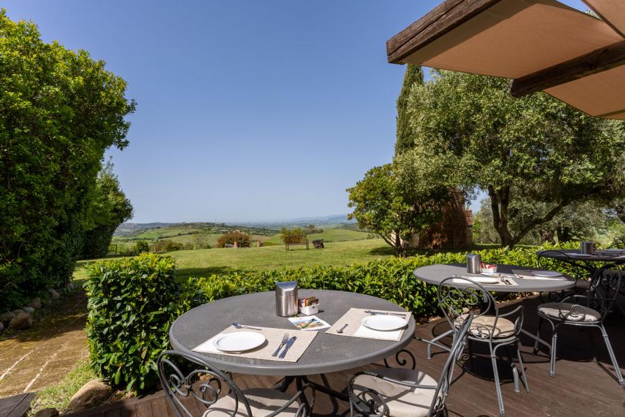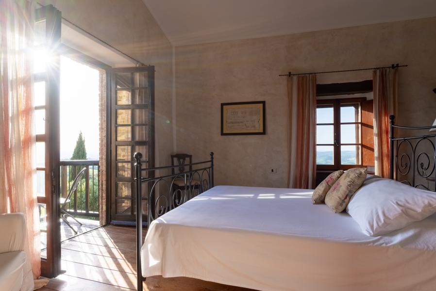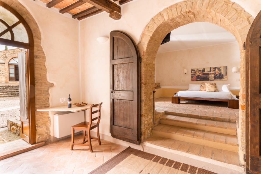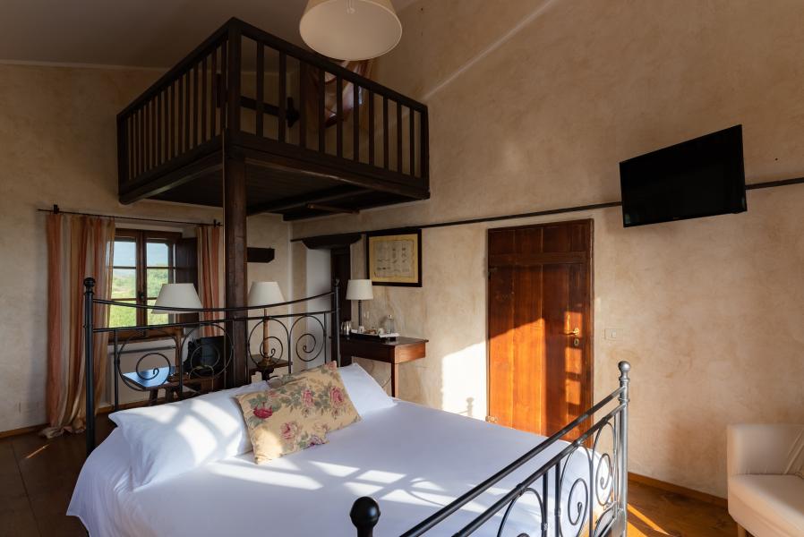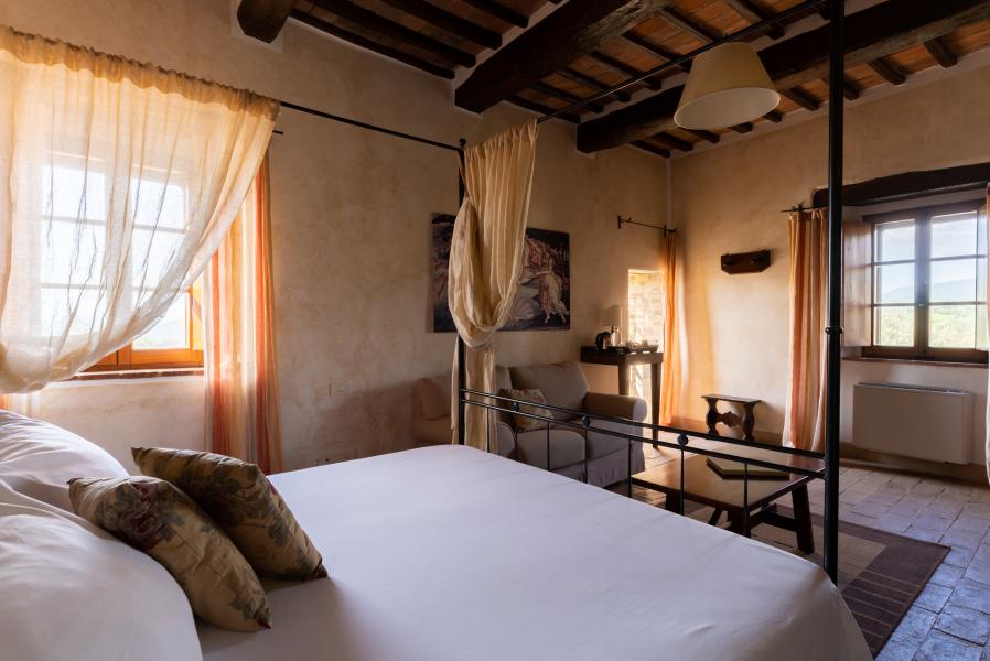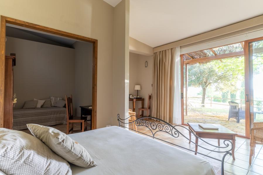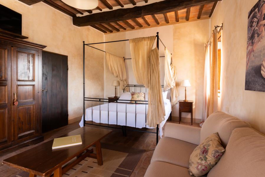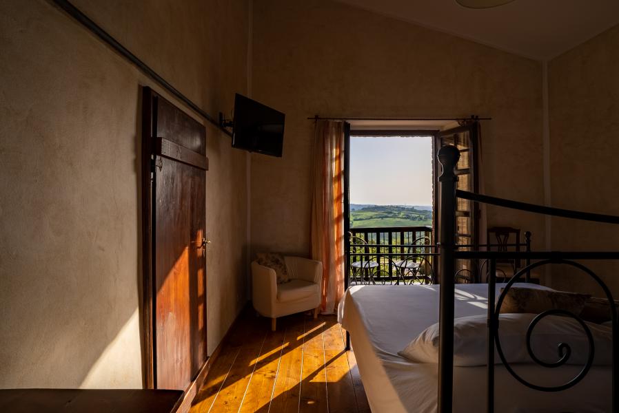 Le camere e le suite in cui la tenuta vi ospita sono semplici ma uniche nel loro genere: oltre a mobili in noce e letti in ferro battuto, la punta di diamante è la vista che regala a ogni ospite: dal Monte Amiata a est e filari di ulivi a sud fino alle colline maremmane e sul mare fino all’isola d’Elba.