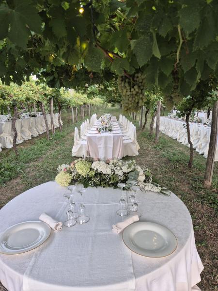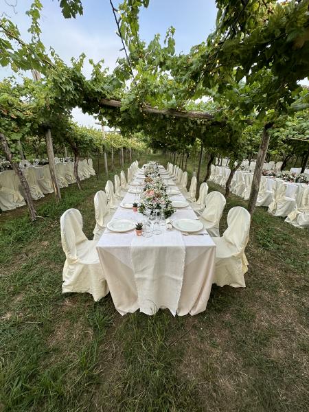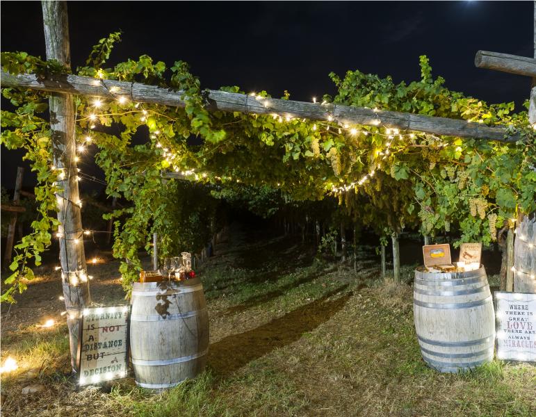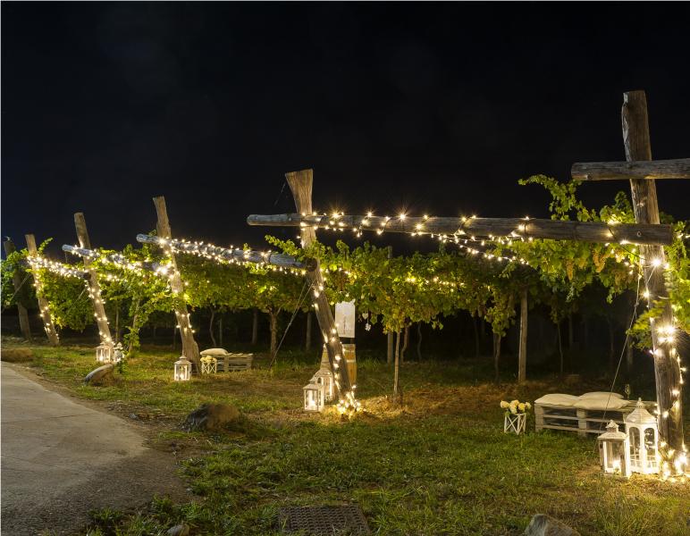 I nostri suggestivi vigneti: vigneti a pergola circondati da lucine scintillanti, ideali per cerimonie simboliche, aperitivi, banchetti e addirittura l'intero evento.