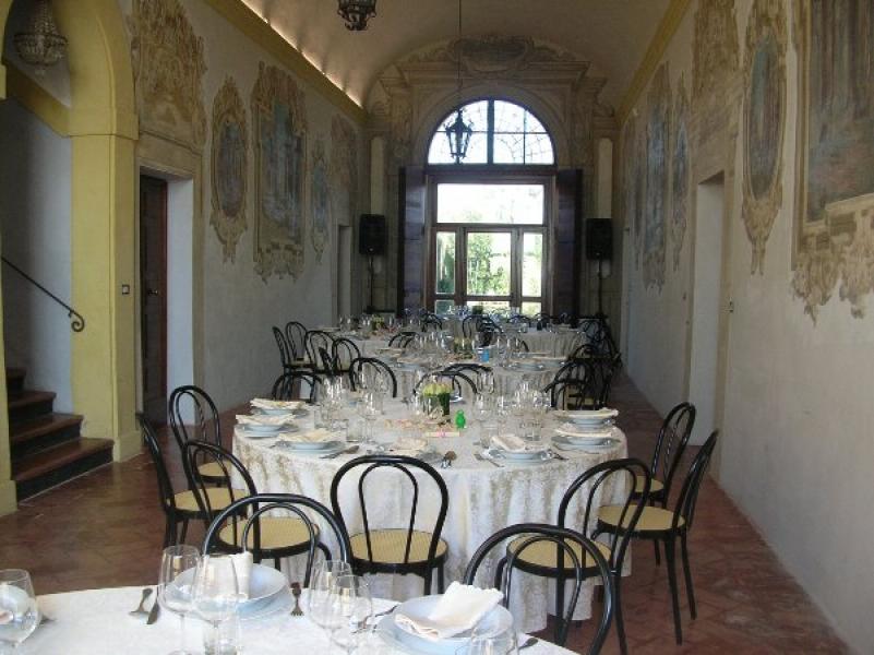 La villa, estremamente semplice all'esterno, vi accoglie con i sui bellissimi muri affrescati e l'antico pavimento in cotto bolognese. Tre sale comunicanti si affacciano su una loggia che può ospitare da sola 70 persone sedute ai tavoli.