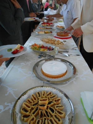 La nostra festa si è svolta in più zone della Masseria: all'aperto, in giardino, il ricco e freschissimo buffet di antipasti ed il cocktail di benvenuto; all'interno, nella bella e suggestiva Sala del Sole, il pranzo, e di nuovo in giardino il buffet di frutta e dolci e l'angolo bar e sigari (menzione speciale per i liquori fatti in casa dai Ruggiero, straordinariamente buoni).