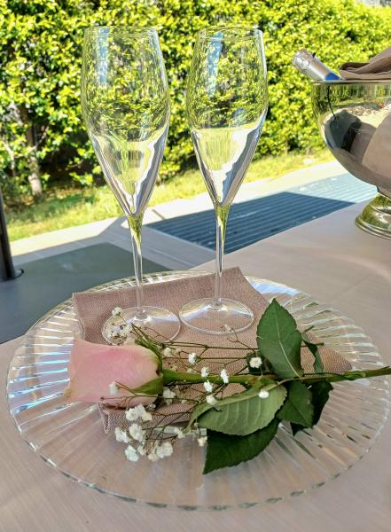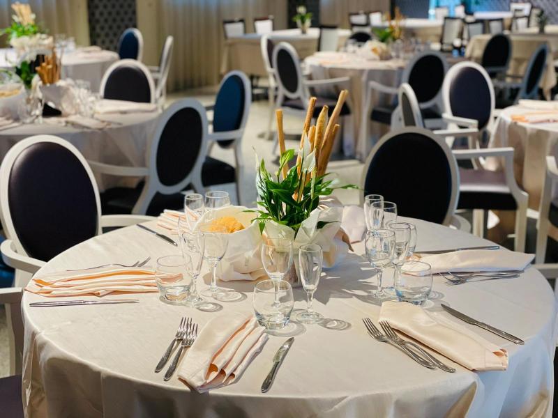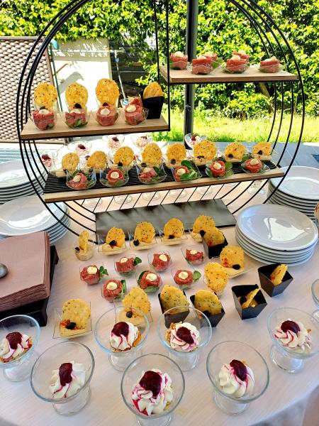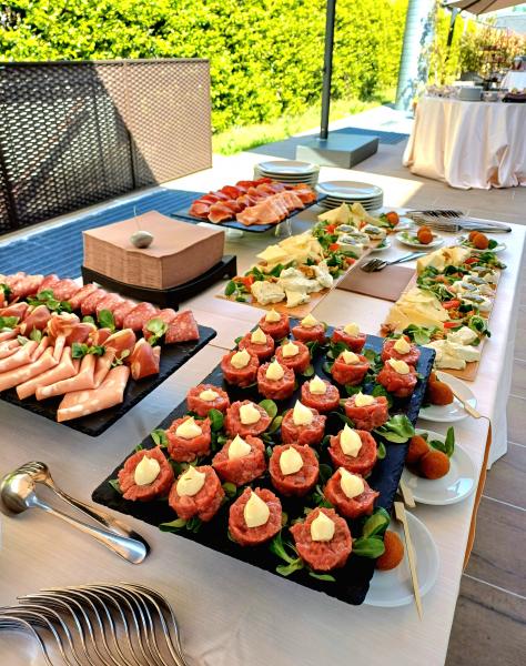 Descrizione: Aperitivo di Benvenuto al Buffet Cocktail Alcolico ed Analcolico Succhi di Frutta Salatini caldi in Sfoglia Pizzette Partenopee Polentine al Gorgonzola Mini Bruschette al Pomodoro Barchette Brisé con Insalata Russa Quadrotti di Focaccia al Rosmarino e Pizza Napoletana Frittatine Assortite Grana in Bellavista Olive Ascolane Menù Veli di Pesce Spada con Finissima di Finocchi Carpaccio di Fassone con Songino, Scaglie di Grana e Sedano Tortino ai Funghi Porcini con Fonduta *** Risotto allo Spumante Agnolotti di Carne al Burro Tartufato *** Involtini di Vitello con Speck e Roquefort Parmigiana al Pane Carasau Sorbetto alla Mela Verde Darna di Salmone in Crosta di Pane con Salsa Bernese Patate al Rosmarino *** Torta Nuziale